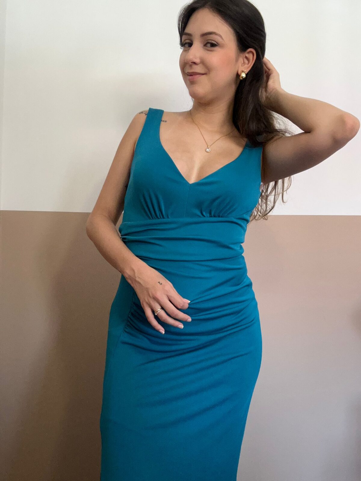 Vestido com reforço no peito franjido na frente, malha fria mas com muita qualidade.
