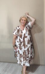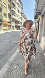Delicadeza e encantamento se encontram neste Vestido Floral Branco com Detalhes Castanhos, uma peça que traz à tona a beleza das flores e da natureza em sua forma mais pura. Com um tom branco imaculado, o vestido é adornado com flores suaves e folhas castanhas que criam uma harmonia perfeita entre o leve e o rústico, evocando a sensação de um campo florido em plena transição das estações.